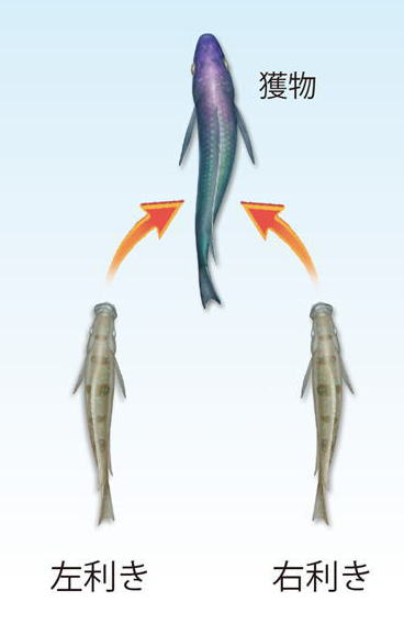 私は、アフリカ・タンガニイカ湖に生息する鱗食魚(りんしょくぎょ)をモデルとして研究をしています。 タンガニイカ湖に他の魚の鱗を食べる魚は7種いますが、研究に用いているのはPerissodus microlepisで、本種を便宜上、鱗食魚と呼んでいます。 ![]() 鱗食魚 Perissodus microlepis 進化の実験室として有名なタンガニイカ湖のシクリッド科魚類は、約1000万年前に湖が形成されて以来急速な種分化をとげ、現在は200種類以上が記載されています。その中で、獲物の魚の鱗を剥ぎ取って食べる鱗食魚(P. microlepis)は、口部形態に明らかな左右非対称性をもち、しかも、種内に左右2タイプがいます。すなわち、本種には左側の下顎骨が大きくて口が右に向かって開く「左利き」と、右側の下顎骨が大きくて口が左に向かって開く「右利き」がいるのです。それらの左右非対称な形態は、より広く口を獲物の体表に押し当てることで、ウロコを効率的にはぎ取れる構造と考えられています。 さらに、他の魚への襲撃方向も形態と対応した一方向からに偏っています。成魚の左利きは獲物の左側から、右利きは右側から主に襲います。また、襲撃時の屈曲運動にも左右差が見られ、利き側からの方が大きな運動パフォーマンスを発揮できます。鱗食魚は、ヒトの利き手に相当するほど、左右性が最も明瞭で顕著な動物の一つです。 ![]() 鱗食魚の利きと捕食行動の1:1対応関係 このように形態と行動に顕著な左右性を示す鱗食魚ならば、どの動物でも明らかになっていない「利きの神経制御メカニズム」にアプローチできると考えて研究を展開しています。 ![]() シクリッドの飼育システム 「鱗食」という食性