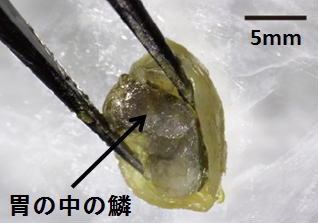 他の魚のウロコを食べるという食性は、タンガニイカ湖のシクリッドでのみ見られるわけではありません。少数派ではありますが、他の地域の淡水魚や海水魚でも見られます。共通するのは、貧栄養下な環境に棲んでいることです。まわりにエサが少ない状況で、もし他の魚のウロコを食べれるようになれば、厳しい環境でも生き残れる可能性が広がります。ただ、鱗をはぎ取って食べる行為は容易ではないので、それに特化した形態や行動、体内メカニズムが必要となります。 また、魚のウロコはケラチンでできていて、消化さえできればタンパク源になり得ます。もちろん、鱗食性魚類はウロコを消化できるような体内メカニズムをもっています。一方で、私たちはケラチンを消化できないので、ケラチンでできているツメや髪の毛を食べても栄養にはなりません。進化の過程のなかで、生存や繁殖にとって重要な性質は生物種ごとに違うからです。 ![]() ウロコで占められた鱗食魚の胃の中身 |